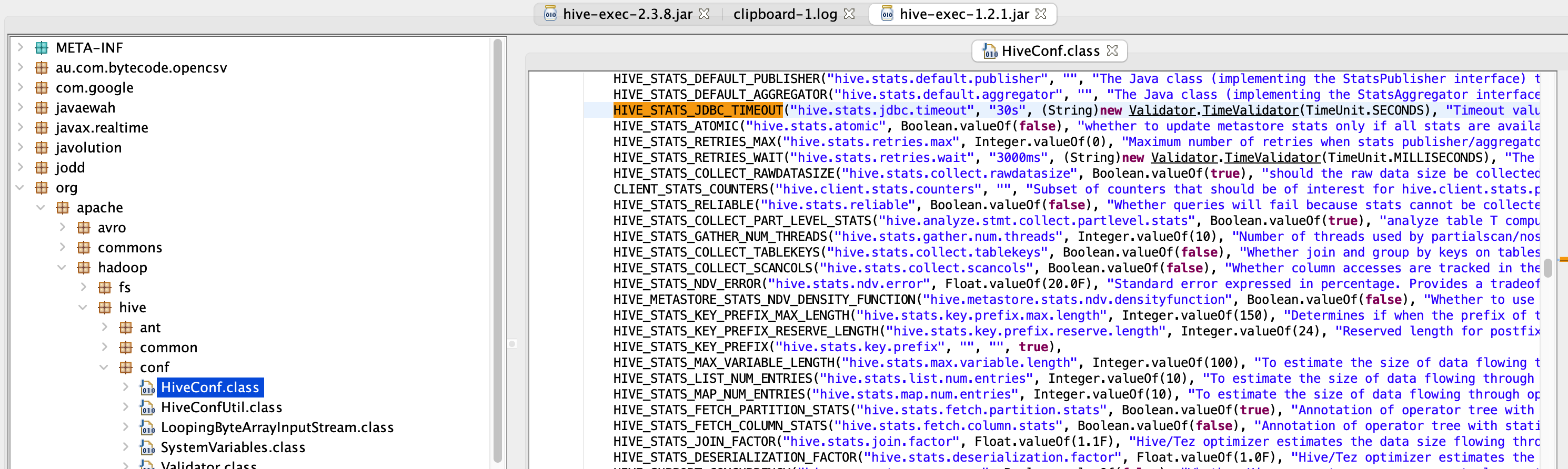hive-exec-1.2.1.jar 파일을 확인하면 해당 필드가 있지만, hive-exec-2.3.8.jar 에서는 해당 필드를 확인할 수 없었습니다.