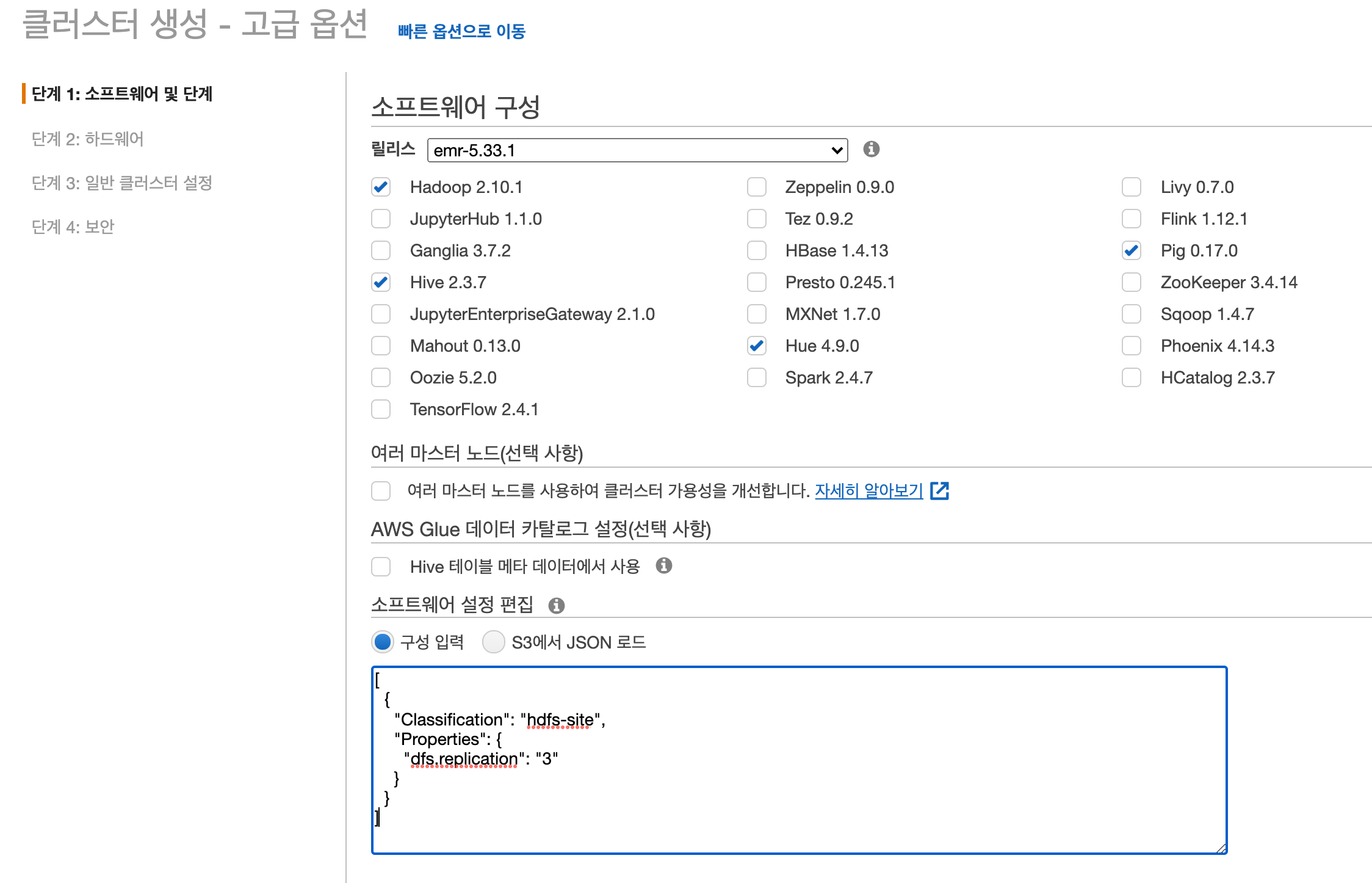 클러스터 생성 시점에 "고급 옵션"으로 이동하고, 소프트웨어 설정 편집, 구성입력에 json 형태의 설정을 입력합니다. 아래와 같이 입력하고 클러스터를 생성하면 설정값이 변경된 채로 클러스터가 생성되는 것을 확인할 수 있습니다.