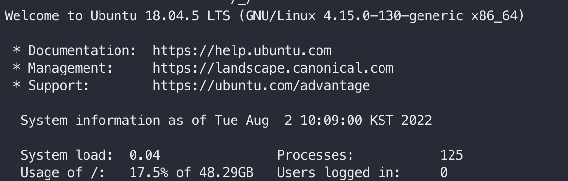 우분투 18.04는 사용자가 로그인하면 Welcome to Ubuntu 라고 출력되며, System information이 포함된 MOTD(Message Of The Day) 화면을 출력합니다.