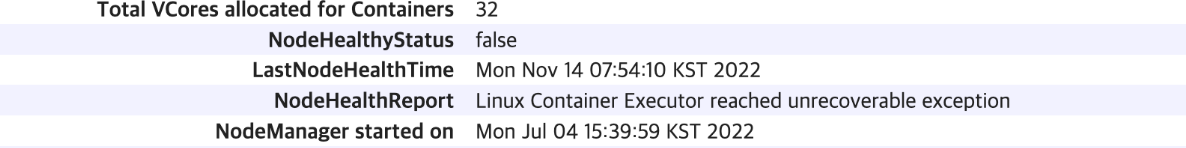 노드매니저가 Linux Container Executor reached unrecoverable exception 오류를 출력하면서 UNHEALTHY 상태로 들어가는 경우가 있습니다.