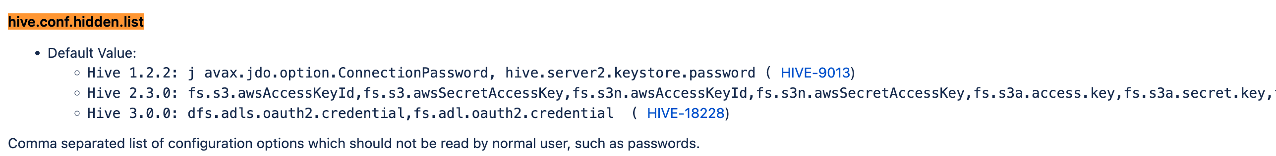 <value>javax.jdo.option.ConnectionPassword,hive.server2.keystore.password,fs.s3a.proxy.password,dfs.adls.oauth</value>