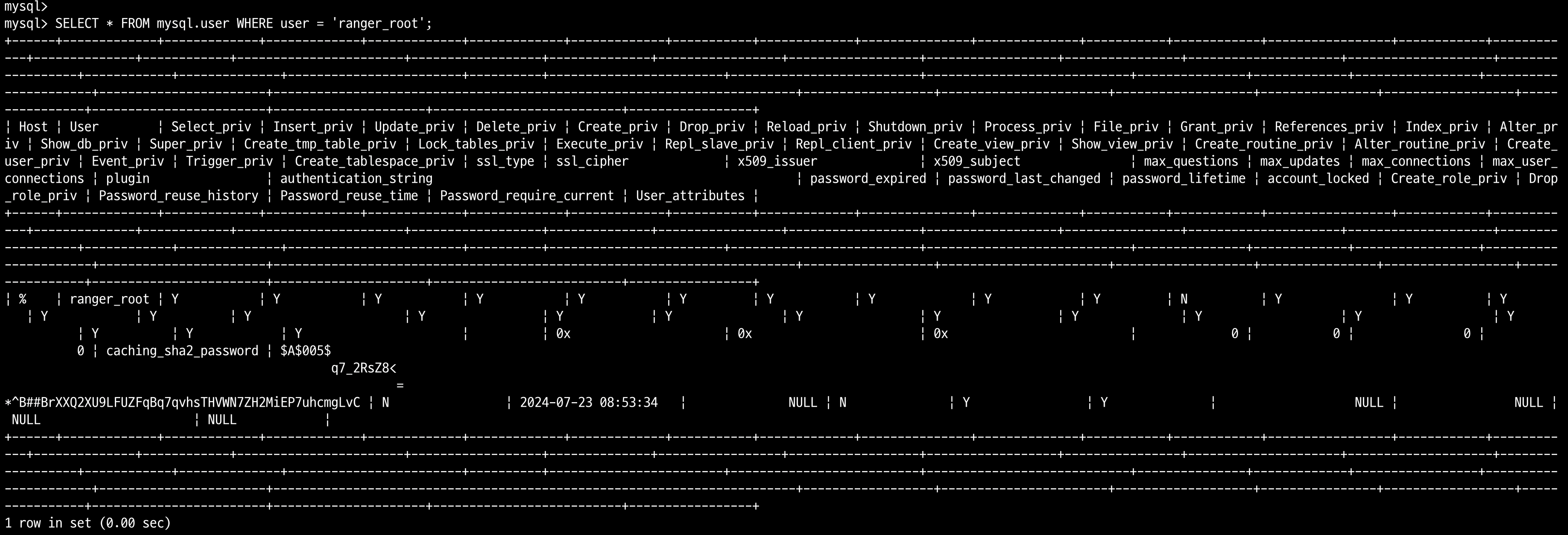 ranger_admin 유저에게 모든 권한을 주었기 때문에 이러한 오류가 발생하는 원인을 확인하기 위해서 mysql.user 테이블을 조회하여 보았습니다. 모든 권한을 주었지만 Grant_priv 칼럼의 값이 N인 것을 확인할 수 있었습니다.