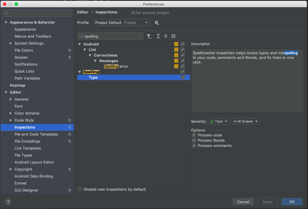 Spellchecking PyCharm helps you make sure that all your source code, including textual strings, comments, literals, and commit messages, is spelt correctly. For this purpose, PyCharm provides a dedicated Typo inspection, which is enabled by default. In the