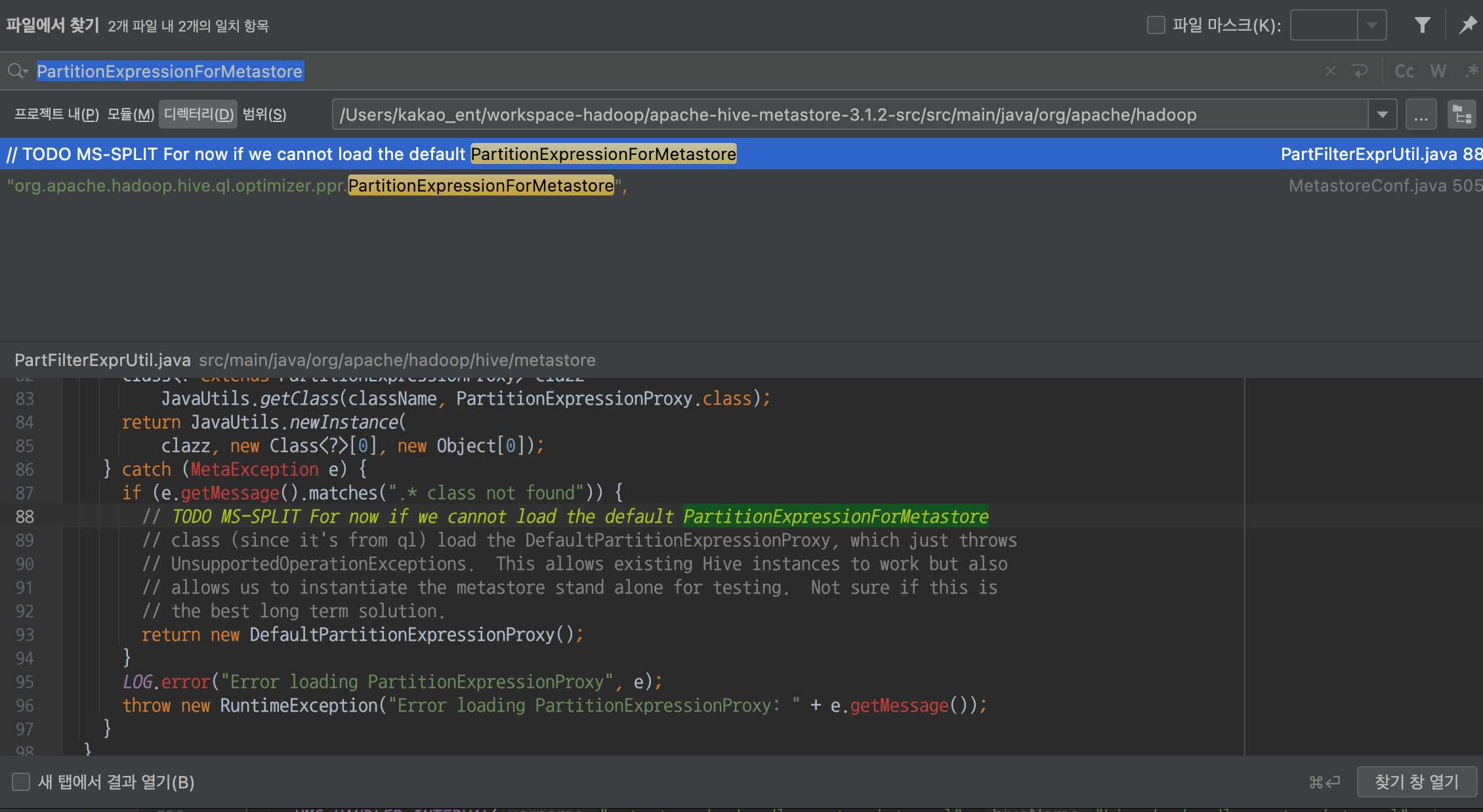 하이브 스탠드얼론 메타스토어(apache-hive-metastore-3.1.2-bin) 에서 파티션 DROP 시점에 다음과 같은 오류가 발생하였습니다.