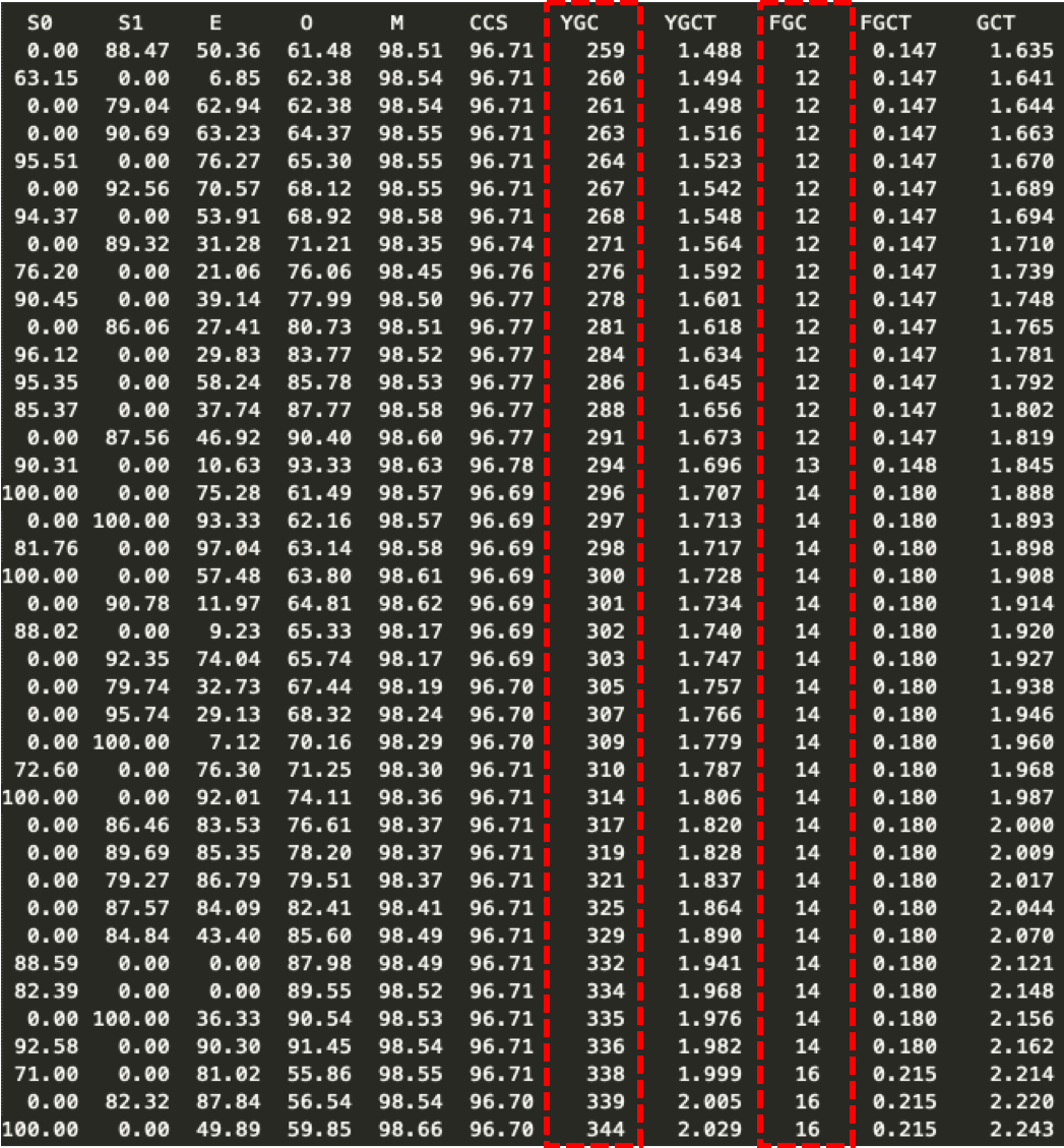 다음은 jstat 명령으로 GC를 확인한 결과 입니다. 1초에 한번씩 확인한 결과인데 마이너 GC(YGC) 카운트와 메이저 GC(FGC) 카운트가 급격하게 증가하는 것을 확인할 수 있습니다.